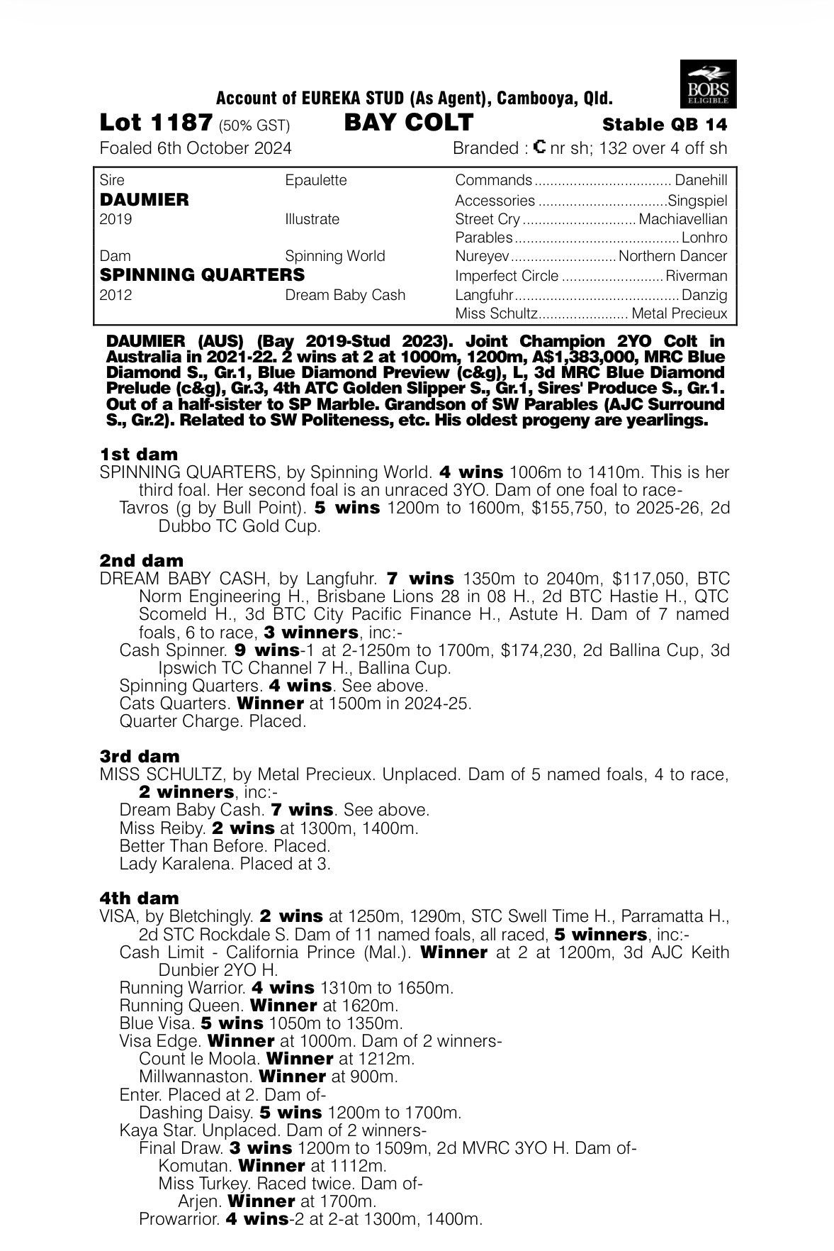 From 4 time winning mare Spinning Quarters. She is the dam of 1 foal to race, Tavros, very well perfomed, winner of 5 races including well performed in the Little Dance and country championships races and finals in Sydney.